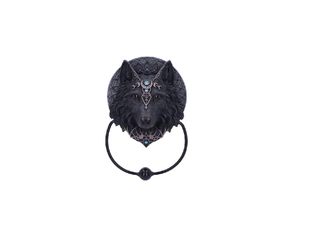 Krásné klepadlo na dveře v podobě vlka s měsíčními ornamenty ochrání váš domov nebo pracovnu! Stylové klepadlo pro milovníky vlků a magie je vyrobeno z kvalitního polyresinu (umělé pryskyřice) a je ručně malováno.Doplňkové parametry