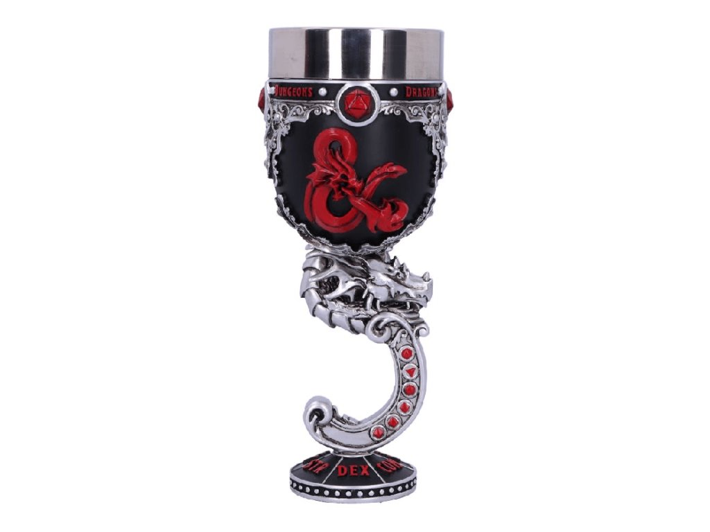 Ponořte se do dobrodružství ve světech Dungeons & Dragons a vychutnejte si vítězství z krásného poháru, který zdobí logo nejproslulejší hry na hrdiny na světě! Noha poháru je tvarovaná do podoby draka. Pohár pro hráče i Dungeon Mastery - dodá vašemu hraní tu správnou atmosféru! Uvnitř poháru se nachází vyjímatelná nerezová vložka pro snadnější údržbu, samotný pohár je z resinu (syntetická pryskyřice). Resinový pohár není vhodný do mikrovlnné trouby ani myčky nádobí!Doplňkové parametry